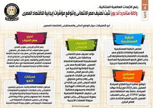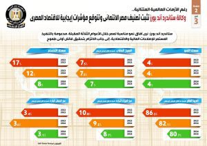 ونشر ايضا المركز الإعلامي لمجلس الوزراء تقريراً تضمن إنفوجرافات تسلط الضوء على تثبيت وكالة ستاندرد آند بورز تصنيف مصر الائتماني رغم الأزمات العالمية المتتالية وتوقعها مؤشرات إيجابية للاقتصاد المصري.